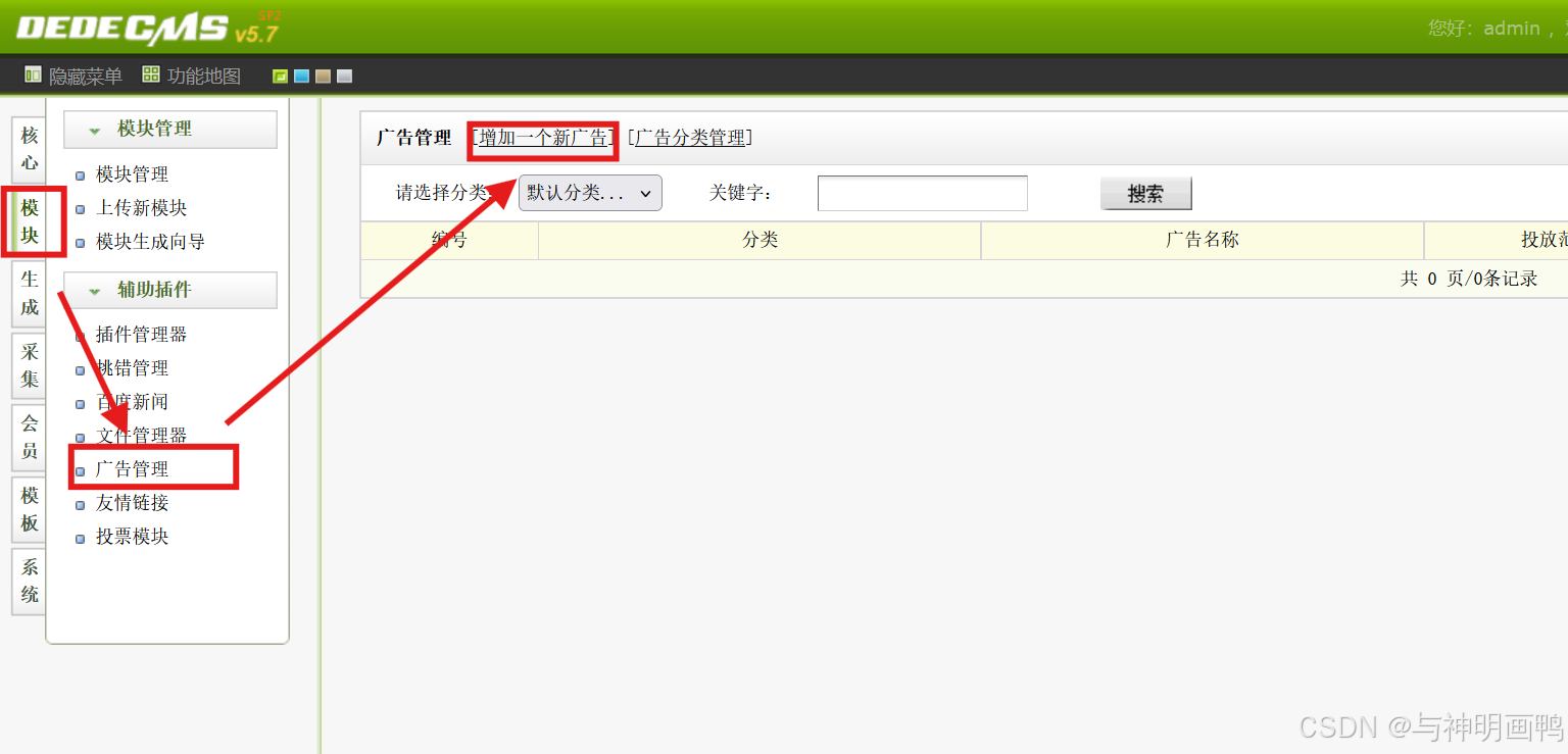 依次点击模块--广告管理--增加一个新广告