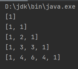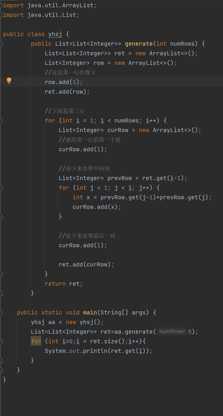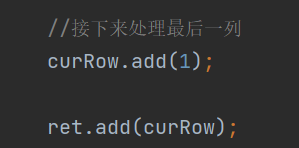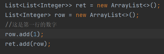 这段代码的意思就是首先建立一个二维的数组ret,然后再建立一个一维的row数组。在一维数组中添加一个1进去,然后结合我上面讲的List<List<Integer>>这个是一个二维数组,然后将row添加到ret中,就是将row数组加到了ret数组中了。row就是ret中的第一行!