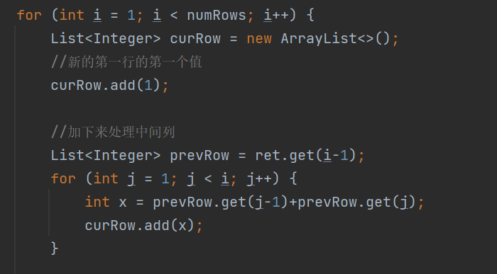 numRows是要计算到多少行,在每一行开始都设置了一个一维数组,curRow.add(1)是在第一列添加一个1,然后List<Integer> prevRow=ret.get(i-1)的意思是获取上一行的信息。接下来就计算中间列的数值,然后将算入的数值加入进去就行了!