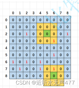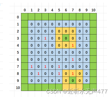 我们也需要注意到这样的问题,每排一个雷,我们就要周围方格雷的数目,这里我们可以将需统计的区域涂为黄色,当我们排到周边的方格时,就可能出现越界的问题。