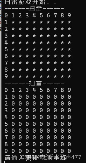 show数组用“*”初始化,mine 数组用‘0’初始化,后面我们就用‘1‘表示雷