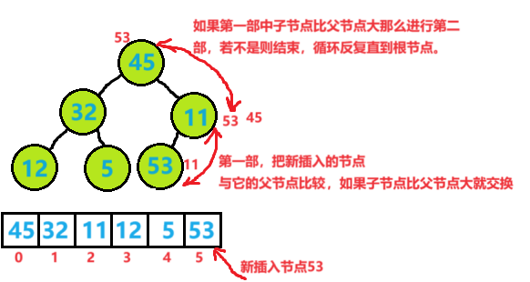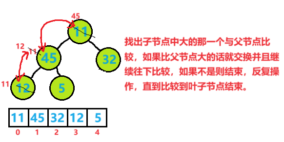 void AdjustUP(HpDataType* arr,int child) { int parent = (child - 1) / 2;//计算父节点下标 while (child>0)//注意这里不能是parent>0 { if (arr[child] > arr[parent]) { Swap(&arr[child], &arr[parent]);//封装一个函数进行交换 child = parent;//更新子节点 parent = (child - 1) / 2;//更新父节点 } else break; } }★如果是小堆只需要把if条件的大于号改为小于号