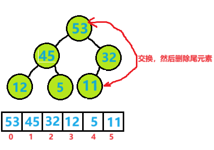 要注意删除元素我们删除的不是尾元素,这样毫无意义,我们删除的是下标为0位置的元素,它是整个堆中最小或最大的元素。怎么删除呢?直接将它删除然后后面的元素在覆盖上吗?这样做的话,它就不是堆了,而且元素之间关系将会全部混乱,就需要从0开始创建堆,效率非常低,我们可以把首元素与尾元素互换然后删除尾元素,虽然这个操作过后它也可能就不是堆了,不过我们可以将首元素向下调整,让它成为堆。比刚才的方案效率要高得多。
