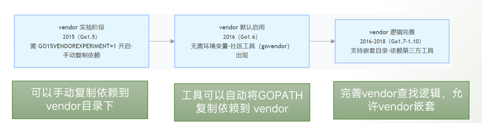 在这种情况下,许多厉害的开发者们开始想办法去改变这种现状,他们开始开发自己的第三方工具去管理依赖,而不仅仅只用Go path 于是在go 1.5版本后,引入了 Go Vendor这一实验性功能.