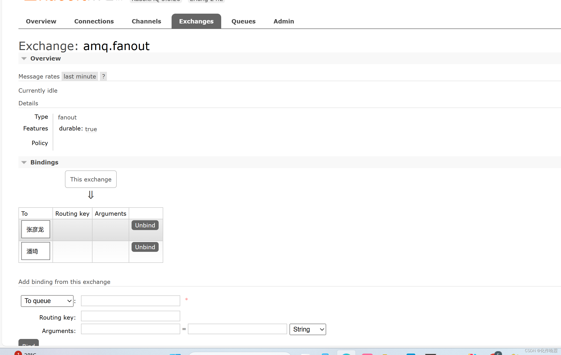 当登陆上MQ,我们创建两个队列,然后使用一个交换机对其进行绑定,这样我们从交换机发送消息,两个队列就可以收到。