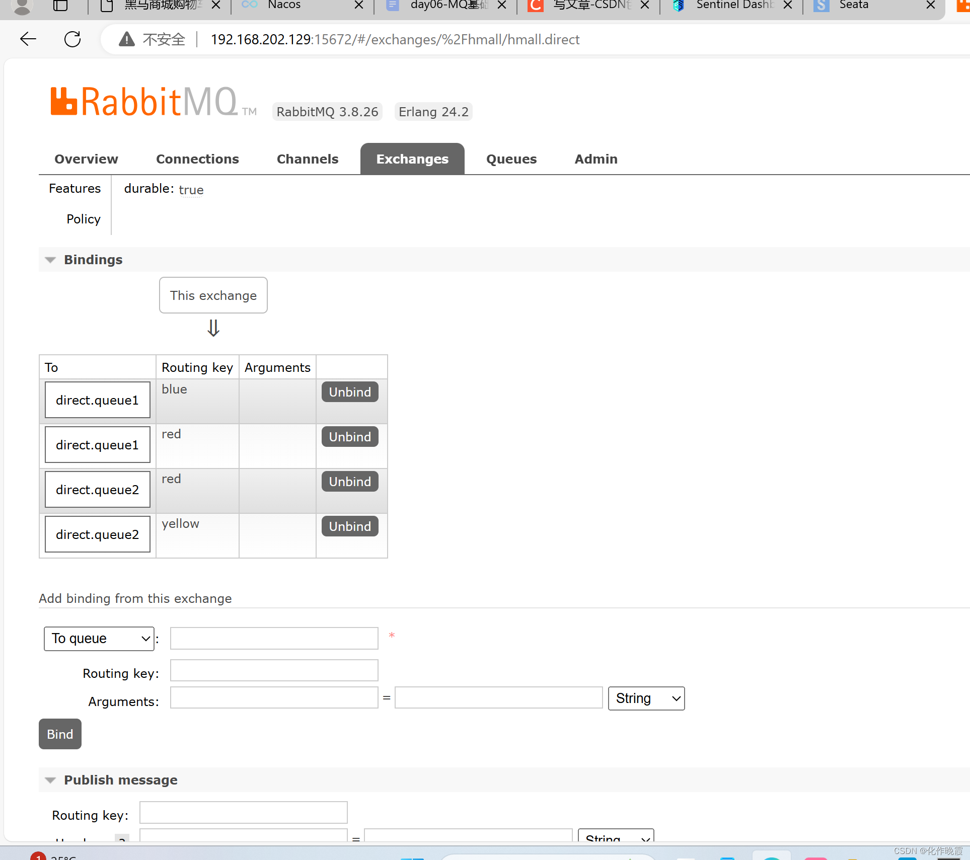 首先我们创建一个direct交换机,绑定两个队列,然后在程序中编写代码。