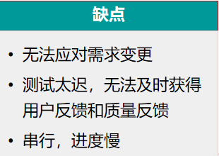 缺点:无法应对需求变更:测试太迟,无法及时获得用户反馈和质量反馈;串行,进度慢