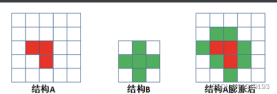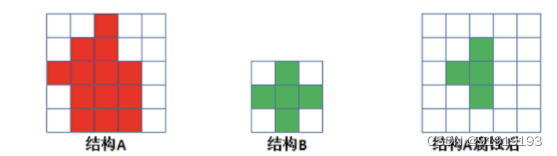 具体操作是:用一个结构元素扫描图像中的每一个像素,用结构元素中的每一个像素与其覆盖的像素做“与”操作,如果都为1,则该像素为1,否则为0。如下图所示,结构A被结构B腐蚀后: