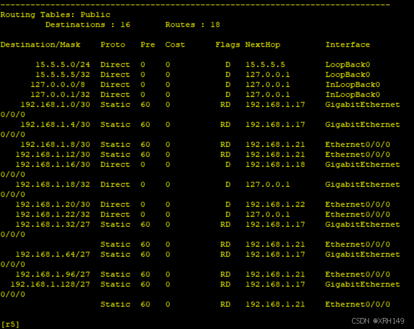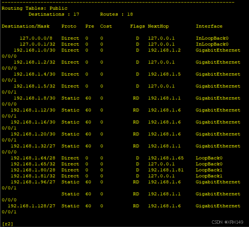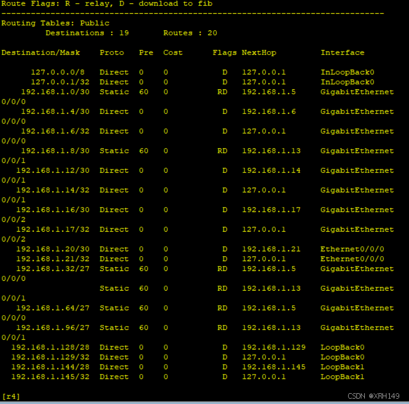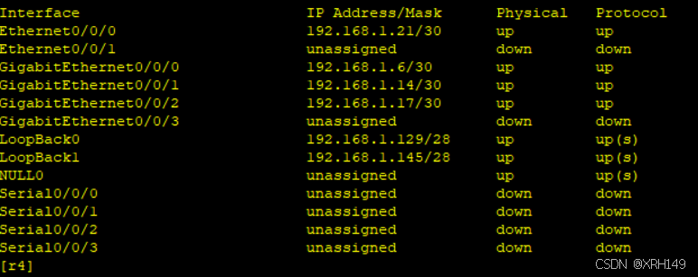 2、r1-r4每个路由器存在两个环回接口,用于模拟链接pc网络;地址也在192.168.1.0/24这个网络范围内
