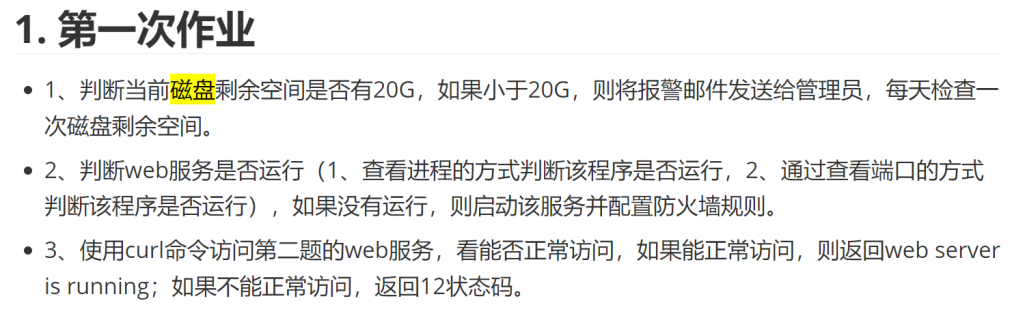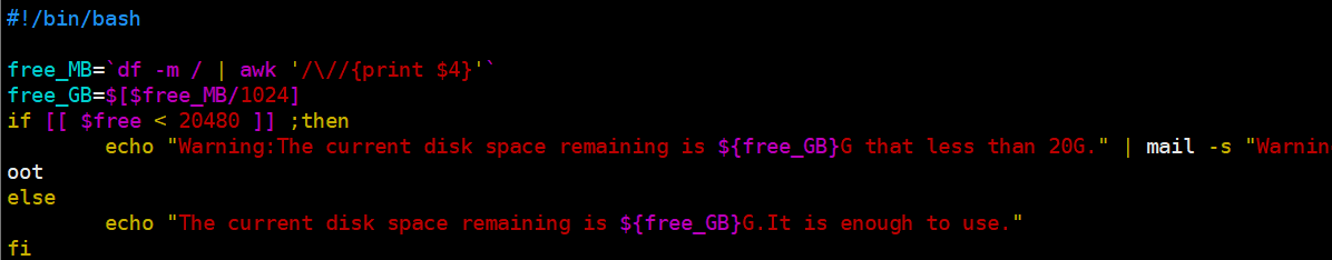 1、判断当前磁盘剩余空间是否有20G,如果小于20G,则将报警邮件发送给管理员,每天检查一次磁盘剩余空间。