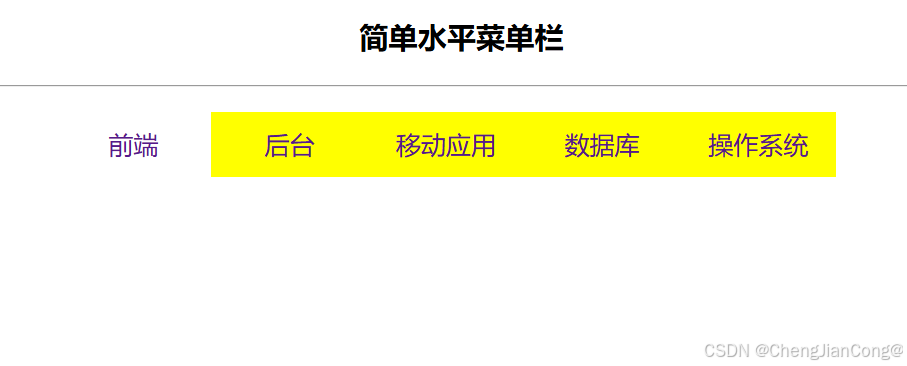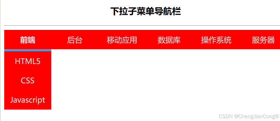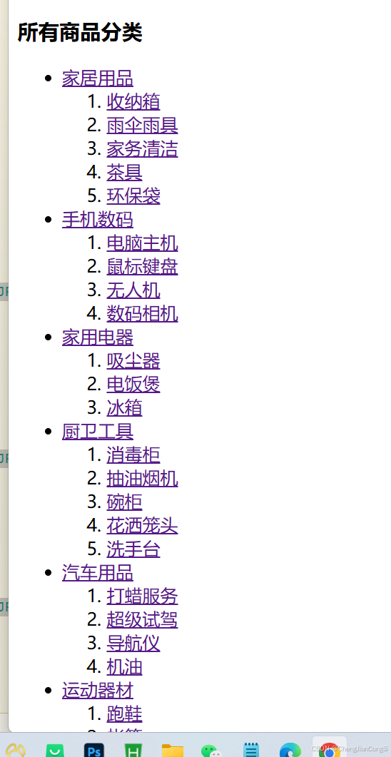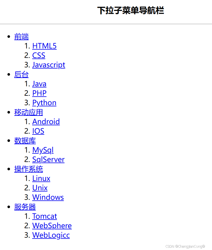 仍然是在<nav>的首尾标签之间,使用<div>标签创建菜单范围,结合无序列表<ul>和有序列表<ol>标签,配合列表选项<li>创建菜单选项。其中选项内容使用超链接的形式,链接地址当前设置为空链接。