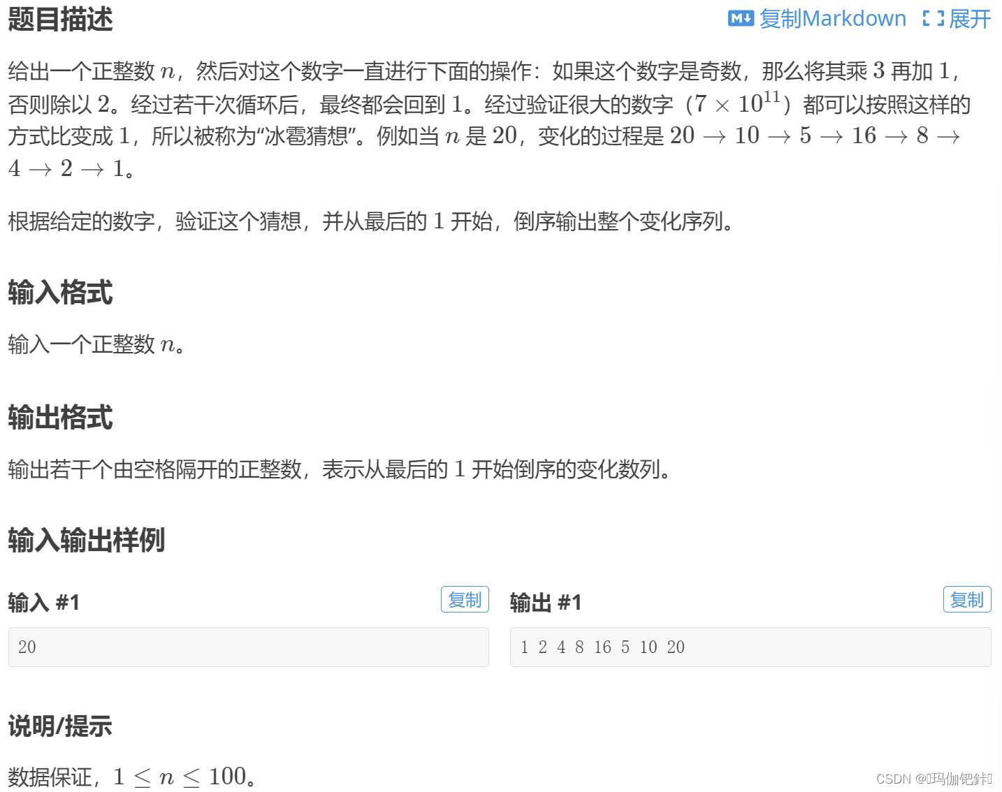 思路:只需要将每次操作得到的数字储存起来之后进行逆序输出即可,因此可以将其存到一个数组里面。将输入的n作为数组的第一个元素,根据n的奇偶得到新的数字作为下一个元素,依此类推直到将1存入数组(可以记下此时1存到了数组里的第几号元素)。最后只需要从1开始逆序输出。