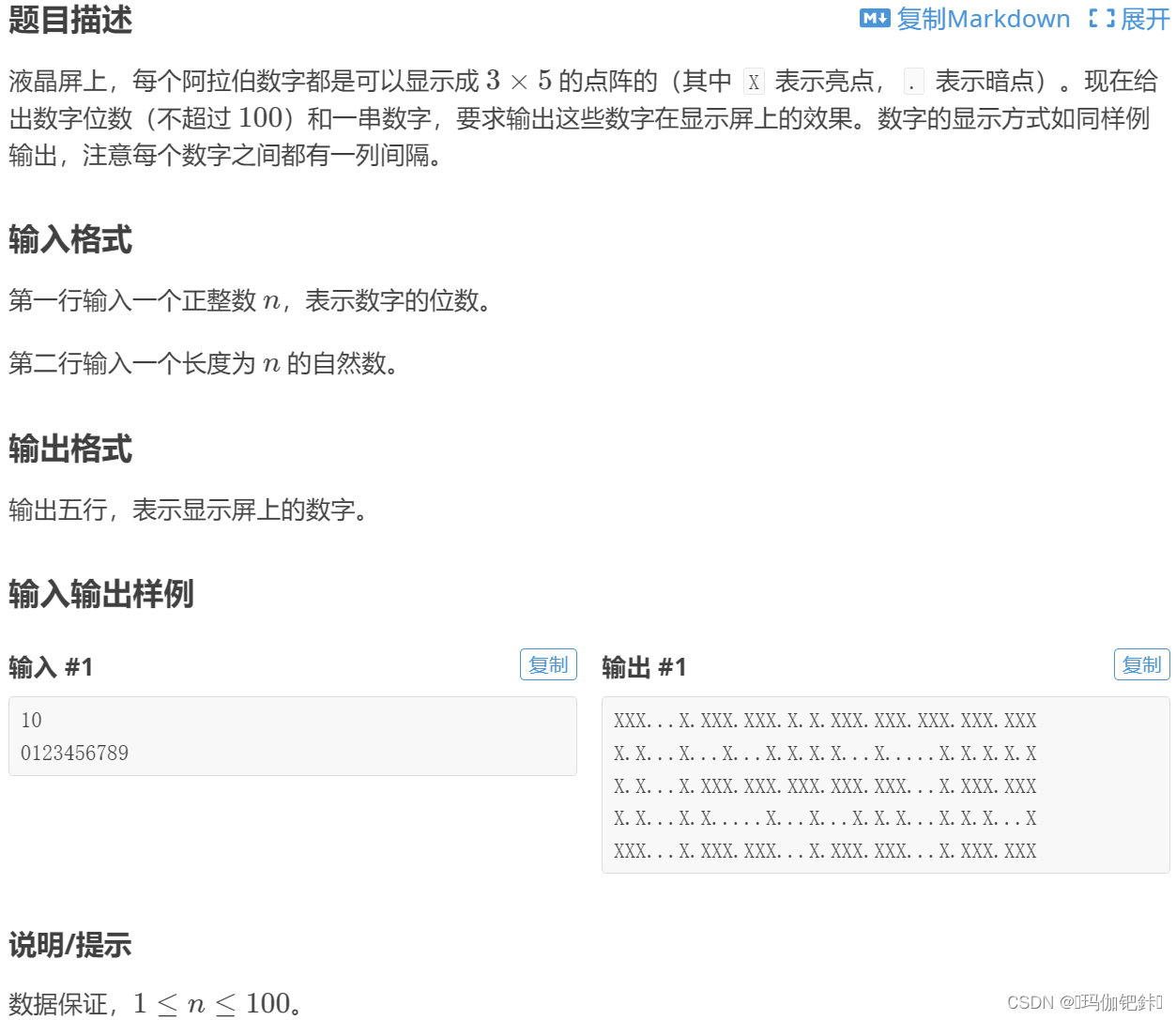 思路:第二行输入可以存到字符串里,使用的时候从最左边开始读取。显示屏上每个数字占据5行3列,每两个数字中间由一列 ' . ',于是可以考虑开辟二维数组,用这个数组充当显示屏,每读取一个数字就显示一个数字。那么可以通过一个计数器指向最左边的第0列,每显示一个数字就右移四列,这样每次只需要操作计数器指向的那一列及其右侧两列即可。