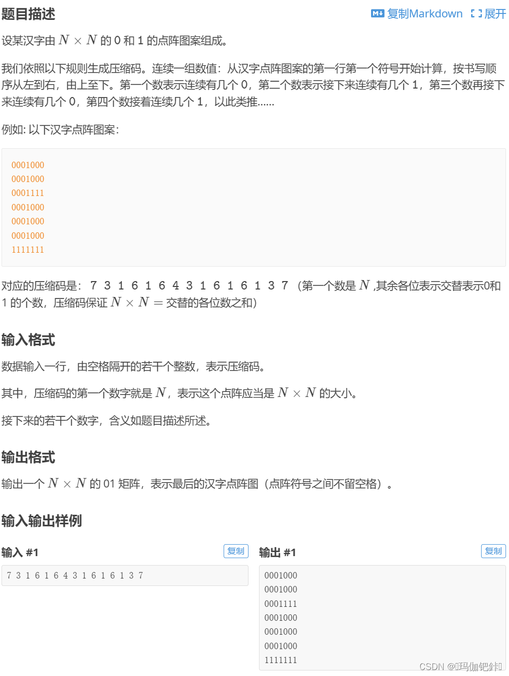 思路:开辟数组之后,可以让x=0、y=0,之后每输入一个数就进行一次填数操作,再通过对a[x][y]赋值进行填数(每当y=n的时候就转到下一行第一个开始填数),再实现填0和1交替进行就可以得到题目要求的点阵。最后输出就可以。