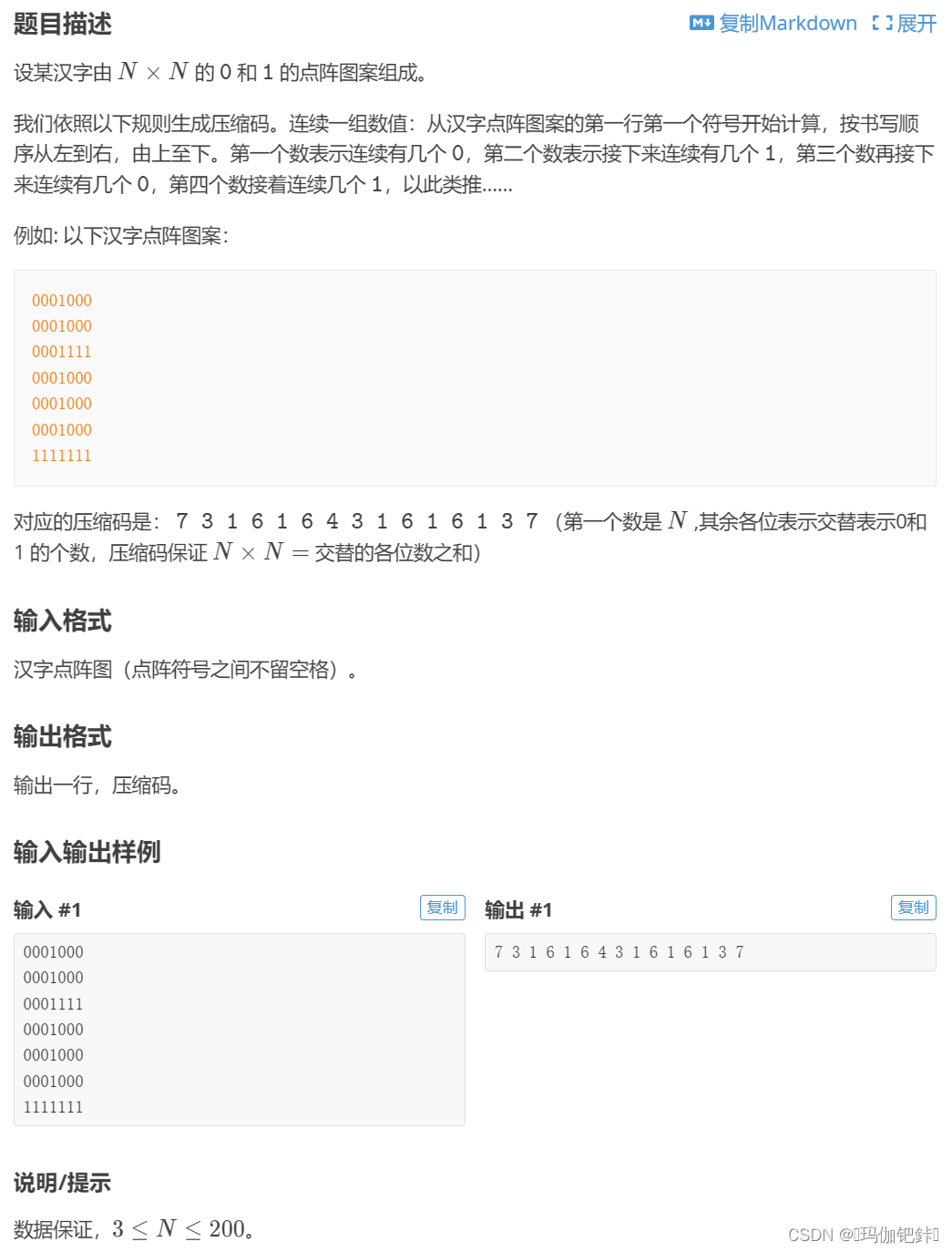 思路:首先输入点阵,那么需要用二维的字符数组来输入储存。这样, 每个位置都对应一个数字,只需要确定该数字是否连续相同、相同多少次就可以。在每次判断之后立刻输出次数即可。