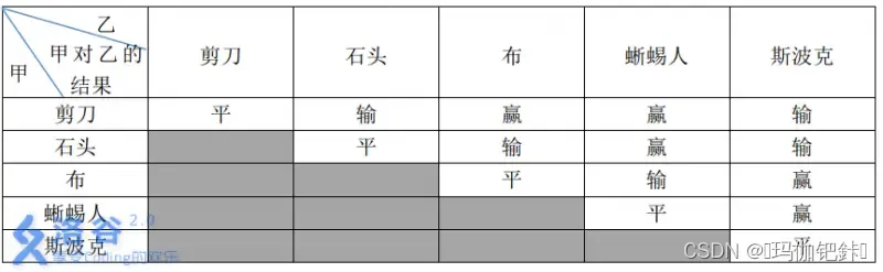 这五种手势的胜负关系如表一所示,表中列出的是甲对乙的游戏结果。