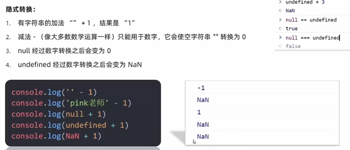 NaN不等于任何人,包括它自己,undefined除了拼接字符串,加任何东西都是NaN