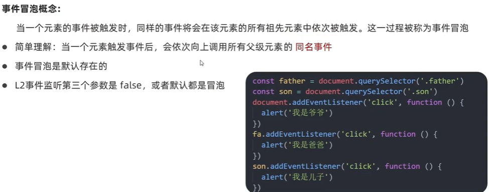 如果不阻止事件冒泡,则当点击我是儿子的盒子时,会依次弹出我是儿子、我是爸爸、我是爷爷,同理,father盒子也是;阻止事件冒泡后,点那个盒子就弹出对应的对话框。