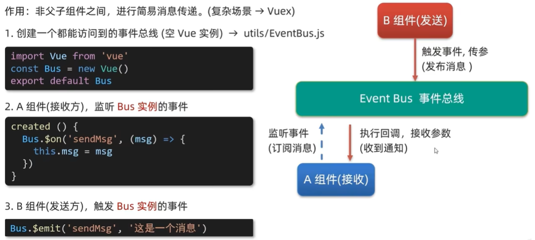 作用:非父子组件之间,进行简易消息传递(复杂场景使用 Vuex)