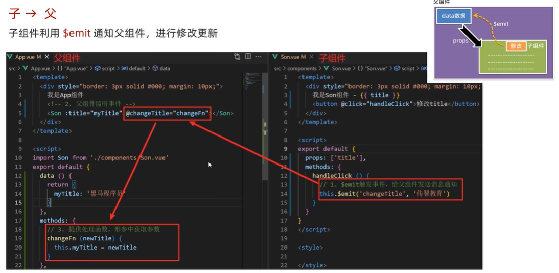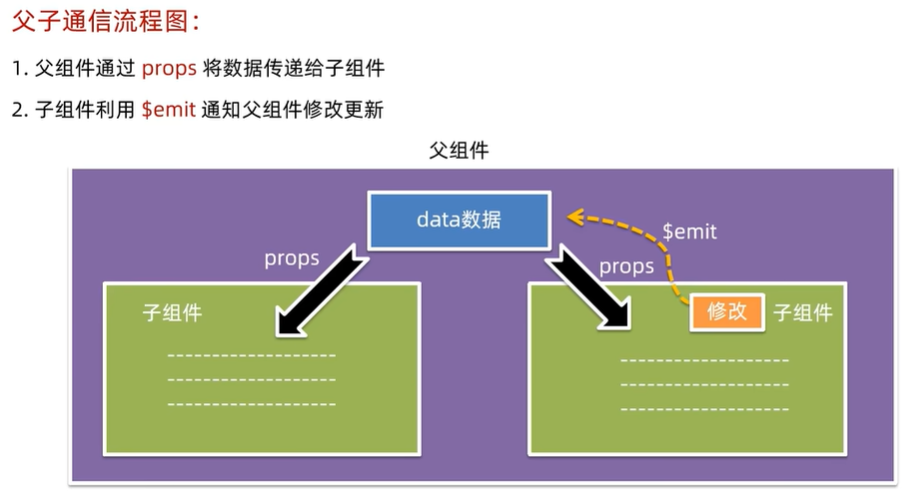 子组件不能直接修改数据,要通过$emit 向父组件发送消息通知,父组件对消息进行监听,提供处理函数,提供逻辑
