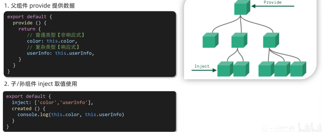 组件通信解决方案:父子关系 --- props 和 $emit ;非父子关系 --- provide & inject / eventbus