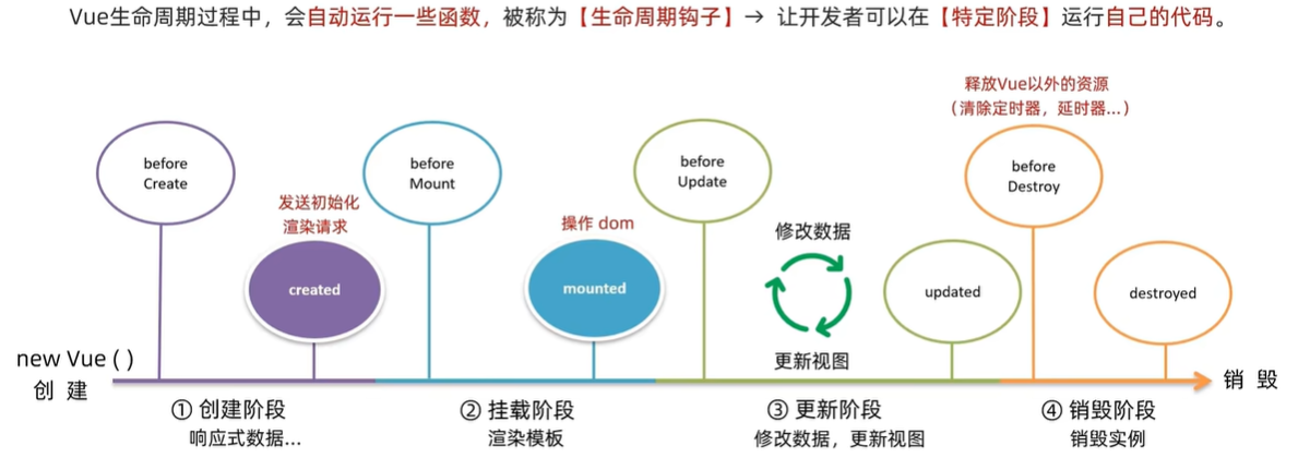 // 4. 销毁阶段 app.$destroy() 并不会把之前渲染的页面情况,会把所有的监听事件等等销毁