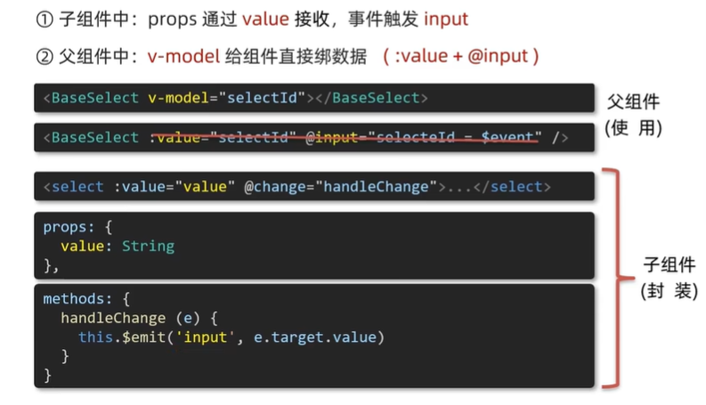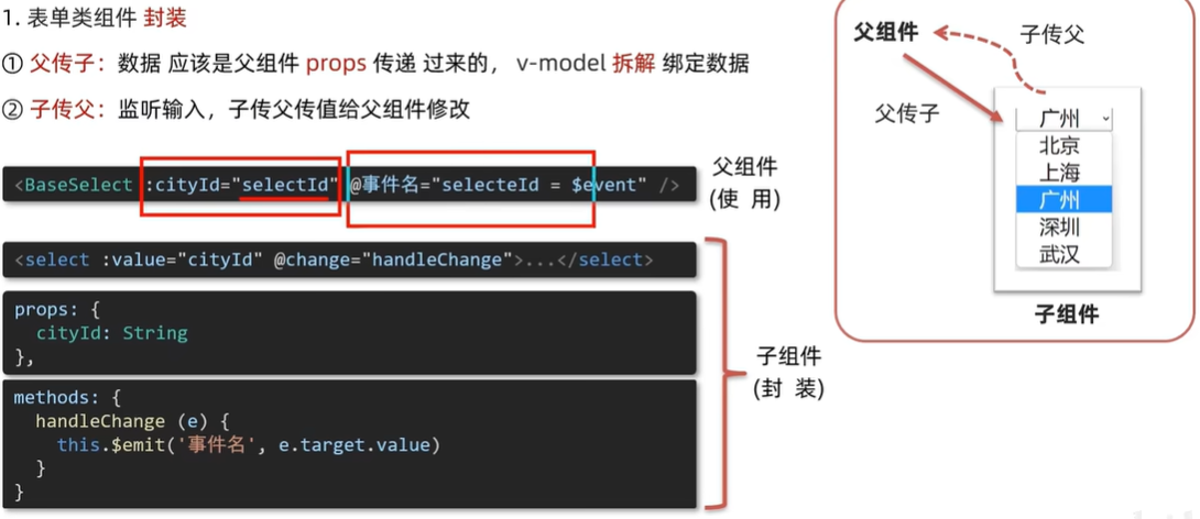 数据在父组件中(以便后续表单提交),v-model不可以直接和父组件的数据绑定(因为v-odel是双向绑定,是可以修改的,但是子组件不能直接修改父组件的数据),将v-model拆解绑定数据,监听数据的变化,子传父,由父组件修改数据。
