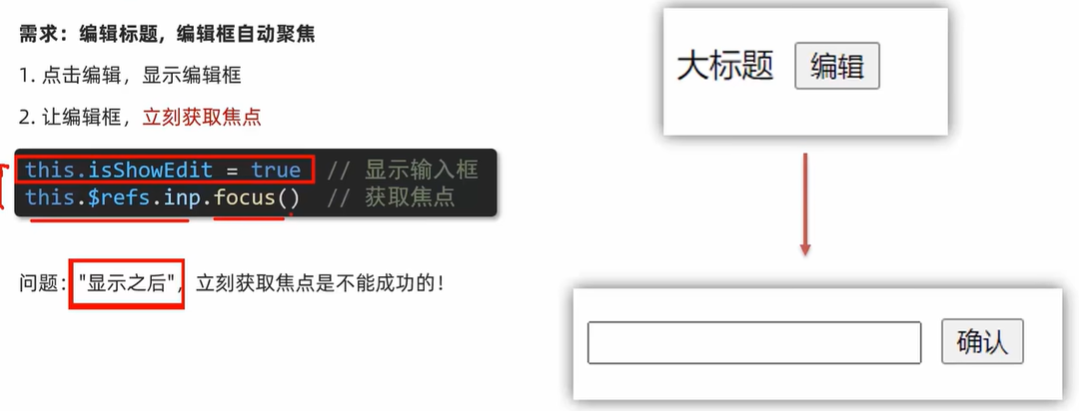 点击编辑后,输入框不能聚焦,因为Vue是异步更新DOM(提升性能)