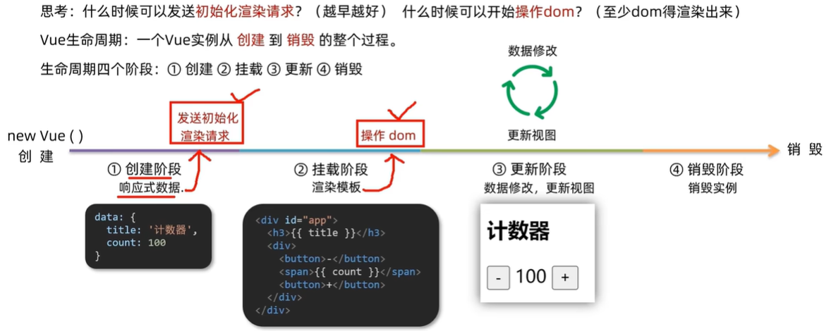 初始化渲染请求越早越好(before creat阶段响应式数据还没有准备好),要在响应式数据准备好才能进行,因此在created中执行。