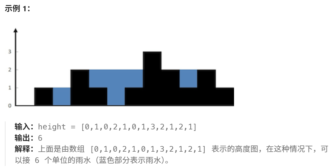 题意:给定 n 个非负整数表示每个宽度为 1 的柱子的高度图,计算按此排列的柱子,下雨之后能接多少雨水。