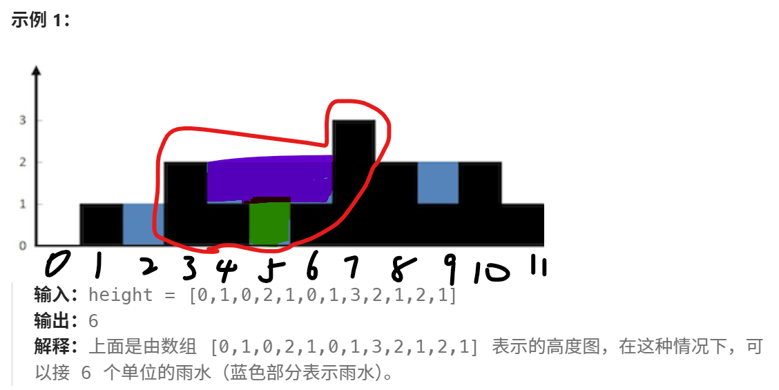 思路:个人感觉是前几十道题里面思维含量最高的一题,这题的难点就是思考什么时候会积累雨水,也就是对答案做出贡献,我们来看这张图,圈出来的地方