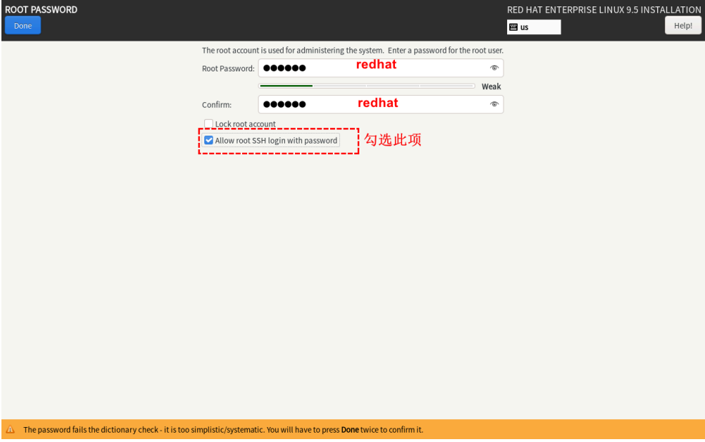 密码输入 redhat,然后勾选“Allow root SSH login with password”选项。设置好后点击 “Done”(需要点2次)完成此项配置,并返回如下图所示界面。