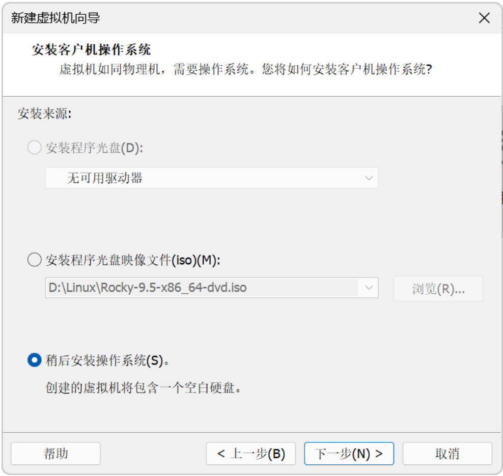 选项“稍后安装操作系统(S)”,然后点击下一步: