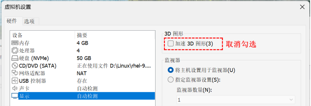 设置好虚拟机关联的 ISO 镜像文件后,再点击左边“显示”,取消 3D 加速,如下图所示: