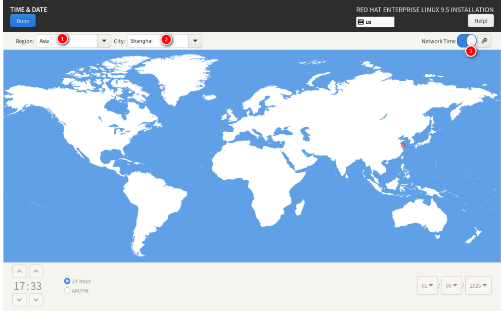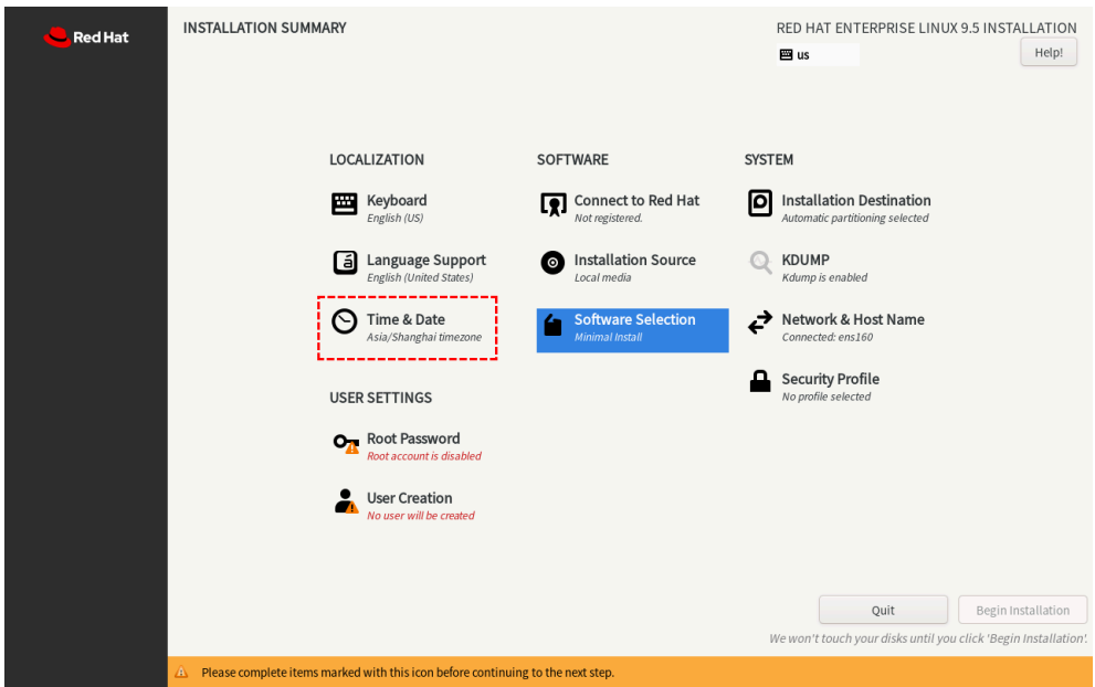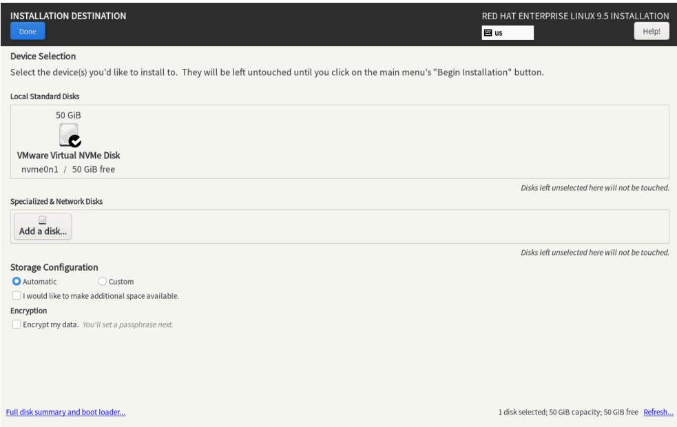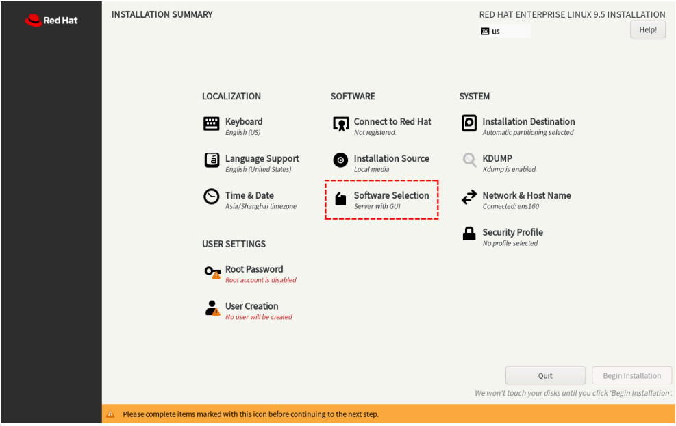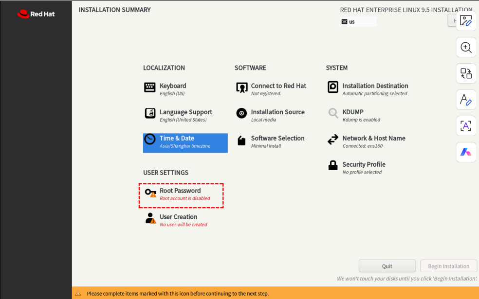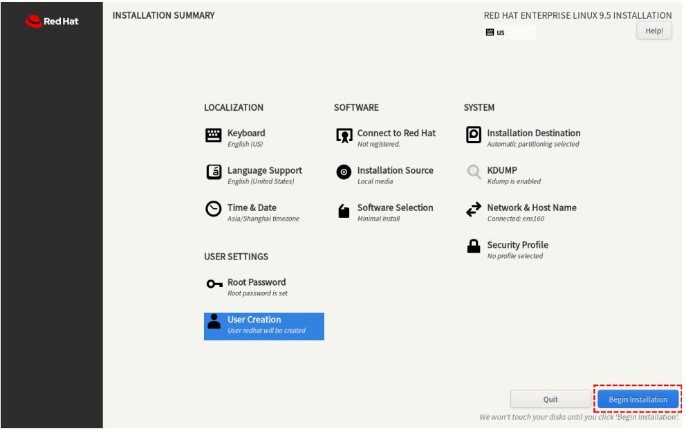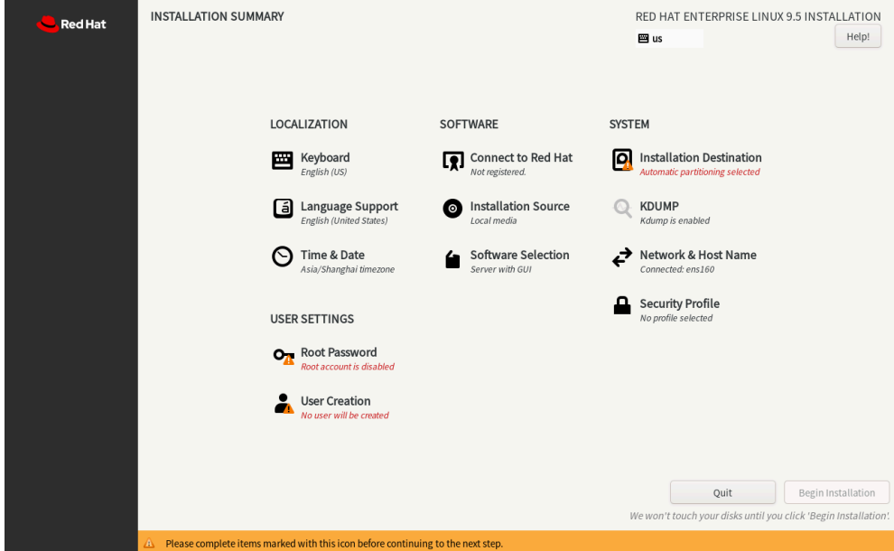 全部都输入 redhat 后,点击2次“Done”完成此项配置,并回到如下所示界面。