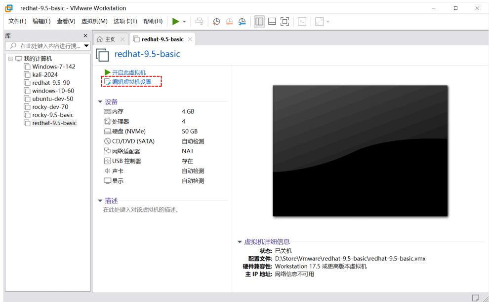 点击上图所示红线框链接,进入编辑虚拟机设置界面,如下图所示。