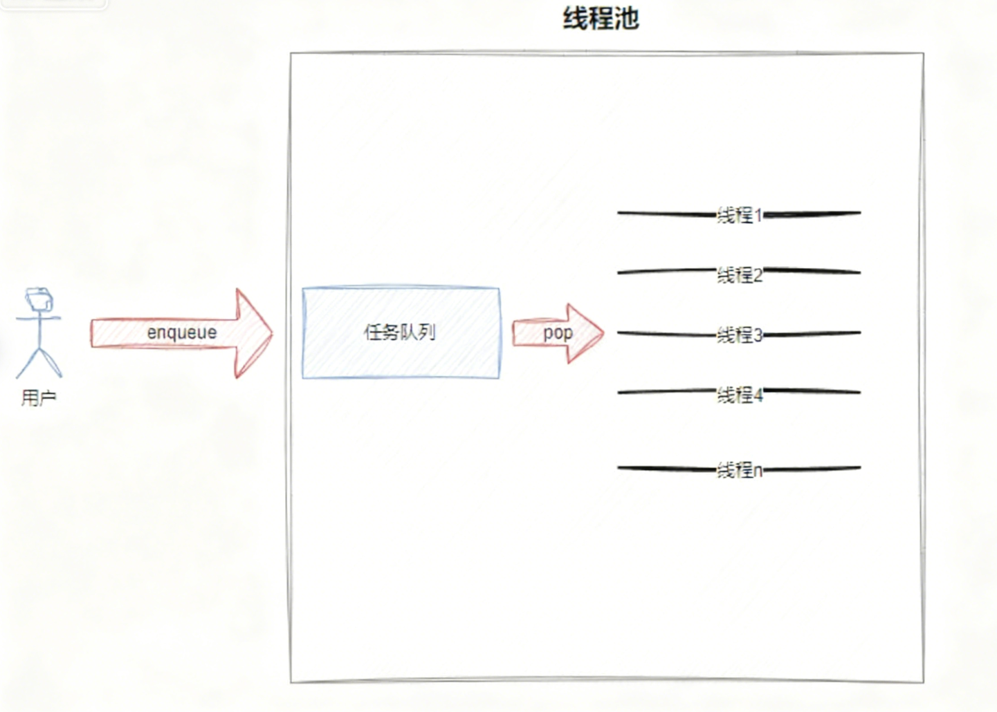 对于使用线程池的用户而言,他仅需要将要执行的任务放入线程池内部的任务队列,然后就可去做自己的事情了,当线程池中有空闲线程时,用户提交的任务就会被执行。