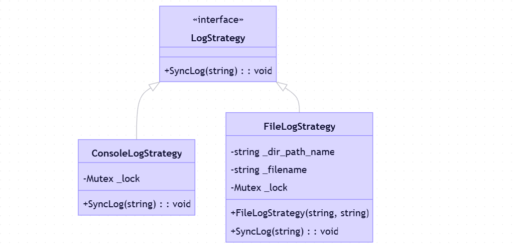 LogStrategy抽象基类定义日志输出接口- 具体策略类(