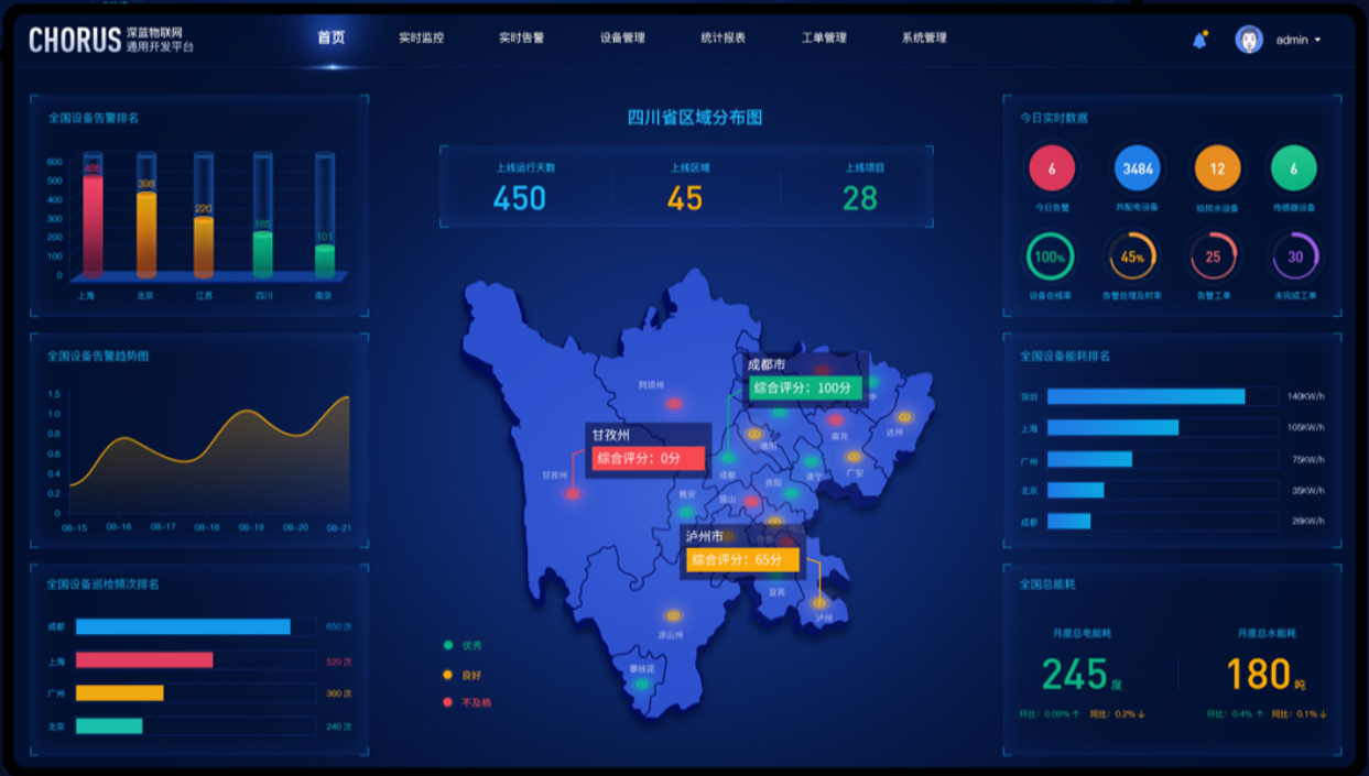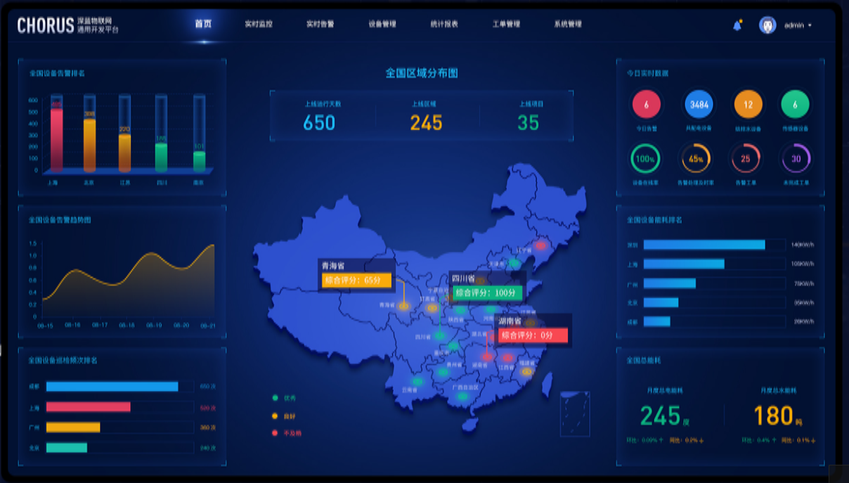 通过可视化大屏,用户可以一目了然地了解物联网系统中各个环节的运行情况和效率指标。如果出现异常或问题,可视化大屏可以及时预警并提供相关信息,帮助用户快速定位问题并采取相应措施,从而提高系统的运行效率和稳定性。