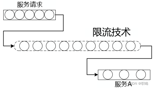 所谓限流即流量限制,解决的是在流量高峰期或者流量突增时服务的可用性问题。我们希望把流量限制在该服务所能接受的合理范围之内,不至于让服务被高流量击垮,如下图所示。