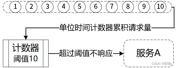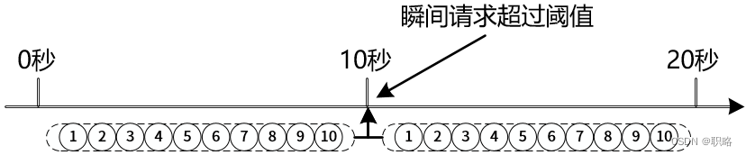 我们设定单位时间是10秒钟,阈值同样是10。假设服务请求在第10秒快要结束的时候一次发送10个请求,这时候一个单位时间结束,计数器清零。那么在第11秒开始的瞬间原则上又可以发送10个请求,这样在这一段很短的时间之内,服务A相当于接收到了20个请求,超过了限流的阈值,可能导致服务失败。整个过程如下图所示。
