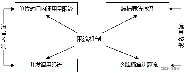 上图展示了用于流量控制的单位时间内调用量和并发调用限流算法,以及用于流量整形的漏桶算法以及令牌桶算法限流。下面我们对这些方法逐一进行展开。