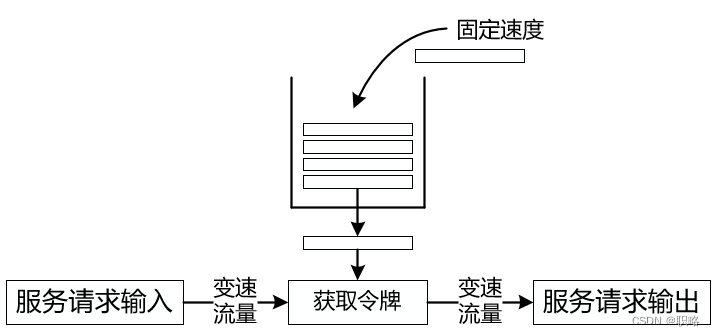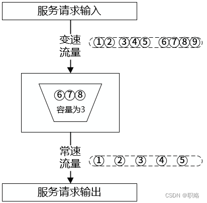 介绍完用于实现流量限制的常见做法之后,我们在看漏桶算法,该算法是网络流量整形的常用算法之一。顾名思义,漏桶算法有点像我们生活中用到的漏斗,液体倒进去以后,总是从下端的小口中以固定速率流出,也就是说不管突发流量有多大,漏桶都保证了流量的恒定速率输出。如果我们把服务调用量看做是液体,那么不管服务请求的变化多么剧烈,通过漏桶算法进行整形之后只会输出固定的服务请求,如下图所示。
