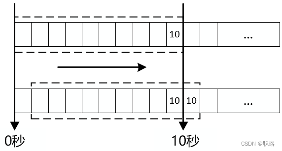 为了解决普计数器的临界问题,我们可以采用滑动窗口(Sliding Window)来进行限流。在滑动窗口中,我们把单位时间设置为一个时间窗口,然后把时间窗口进行进一步划分。比方说我们可以把10秒这个单位时间划分成10个时间格,这样每格代表1秒钟。然后每过1秒,时间窗口就会往右滑动一格。每一个格子都有自己独立的计数器,如下图所示。