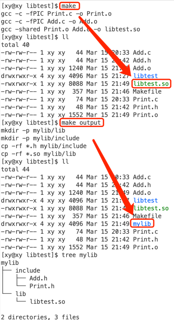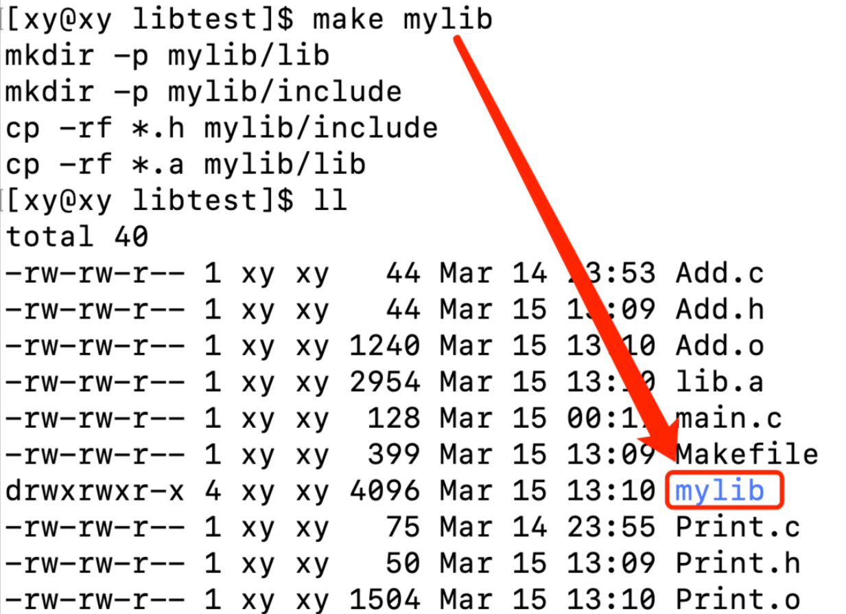 libtest.a : Add.o Print.o # 静态库依赖的目标文件 ar -rc libtest.a Add.o Print.o # 打包 Add.o : Add.c # .o文件依赖的源文件 gcc -c Add.c -o Add.o Print.o : Print.c gcc -c Print.c -o Print.o .PHONY : mylib # 组织头文件和库文件 mylib: mkdir -p mylib/lib mkdir -p mylib/include cp -rf *.h mylib/include cp -rf *.a mylib/lib .PHONY : clean clean : rm -rf *.o mylib libtest.a