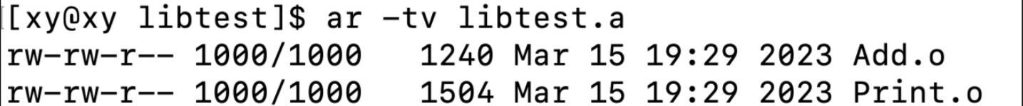 -t和-v选项查看静态库中的文件及信息:ar -tv libtest.a