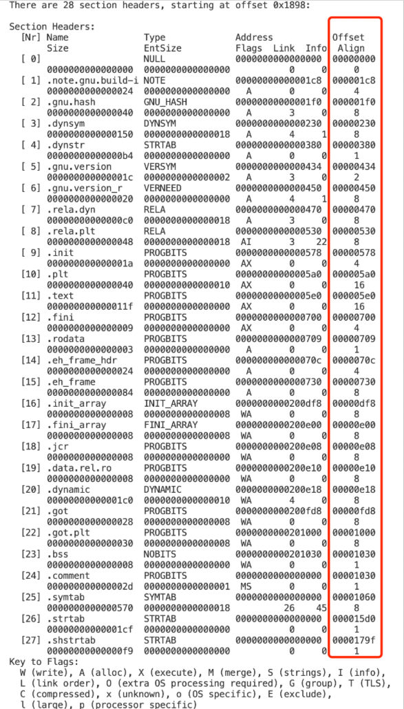 在编译的时候,gcc就已经将地址进行了分配,这些地址就是从00 00 00 00 开始向上生长的,就是线性地址,文件中的内容依据ELF格式进行排列: