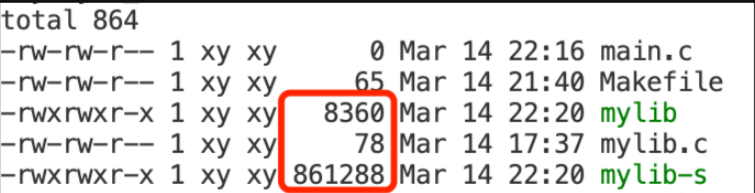mylib-s是静态链接版本生成的可执行程序,可见,动态链接生成的可执行程序的大小比静态链接的小不少。使用