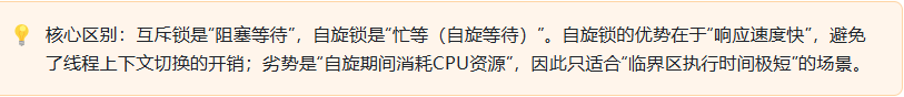 ②多核CPU环境:单核CPU下,自旋线程会独占CPU,导致持有锁的线程无法执行,引发“死锁”风险,因此自旋锁仅适用于多核场景。