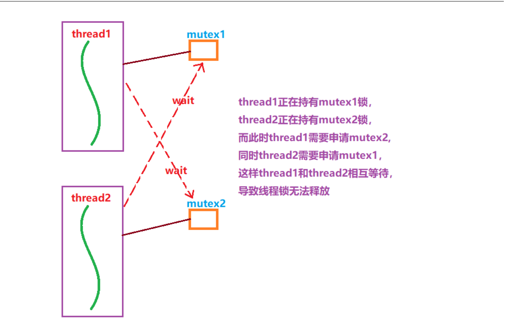 - 所以thread2也需要等待thread1释放mutex1,这样两个线程相互等待对方释放锁才能继续运行后续代码。